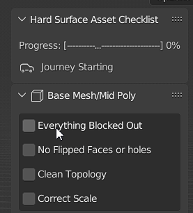A simple addon to help the asset process by giving checks to go through in each stage of the modelling process (except texturing) and to make it fun along the way.